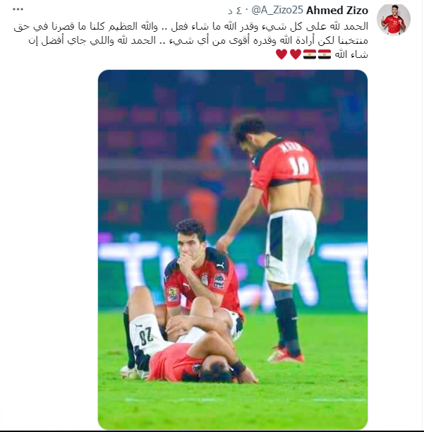 وكتب زيزو عبر حسابه: "الحمد لله على كل شيء وقدر الله ما شاء فعل.. والله العظيم كلنا ما قصرنا في حق منتخبنا لكن إرادة الله وقدره أقوى من أي شيء.. الحمد لله واللي جاي أفضل إن شاء الله".