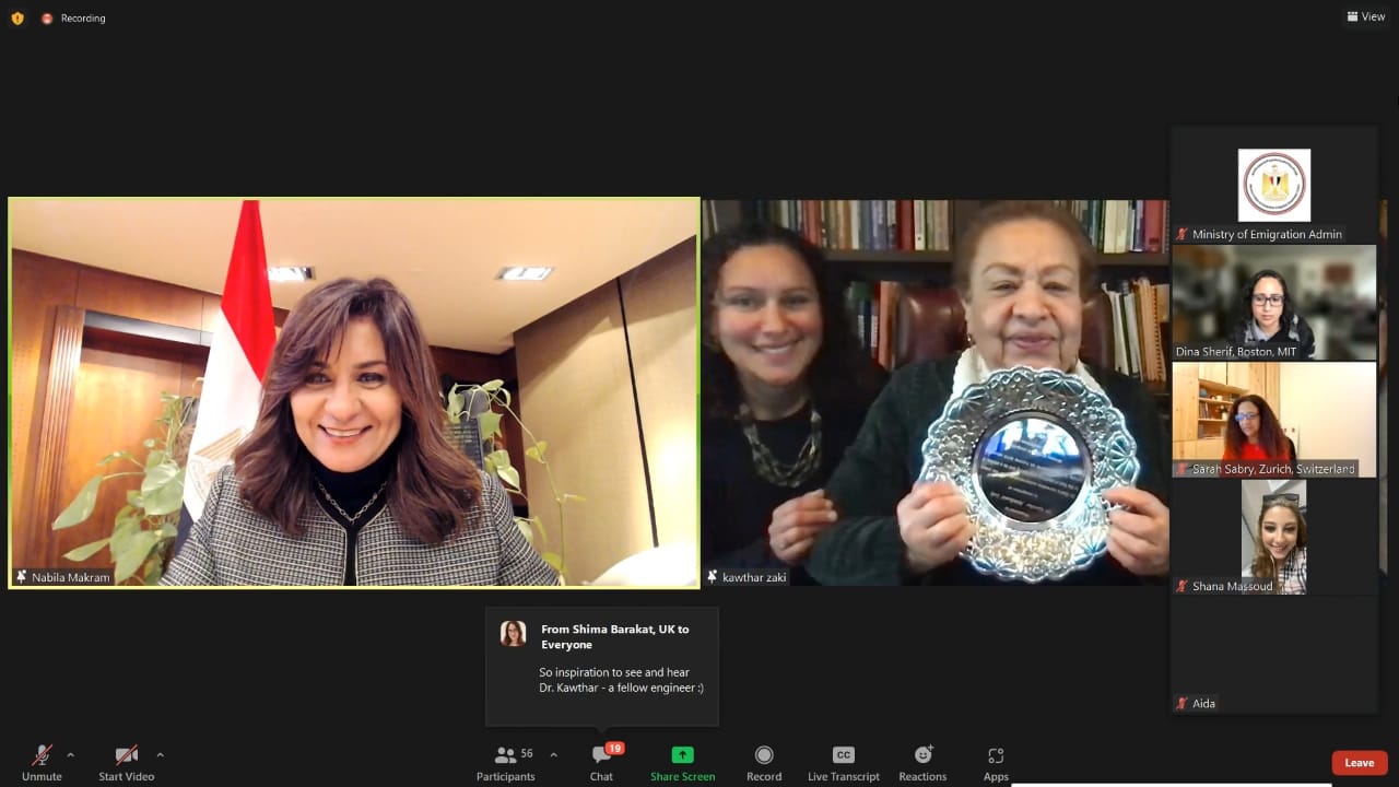 عقدت السفيرة نبيلة مكرم عبد الشهيد وزيرة الدولة للهجرة وشئون المصريين بالخارج، لقاء تفاعليًا عبر تطبيق "زووم" مع عدد من المصريات النابغات والرائدات في عدة مجالات وتخصصات في الخارج، وعلى رأسهن الدكتورة المهندسة الكبيرة كوثر عبد الحميد زكي رائدة الهندسة الكهربائية بالولايات المتحدة الأمريكية.