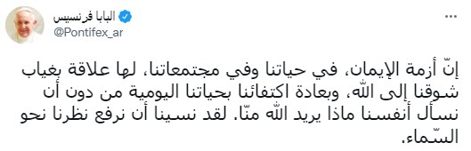 وكتب البابا فرنسيس تغريدة على تويتر "إنّ أزمة الإيمان، في حياتنا وفي مجتمعاتنا، لها علاقة بغياب شوقنا إلى الله، وبعادة اكتفائنا بحياتنا اليومية من دون أن نسأل أنفسنا ماذا يريد الله منّا. لقد نسينا أن نرفع نظرنا نحو السّماء".