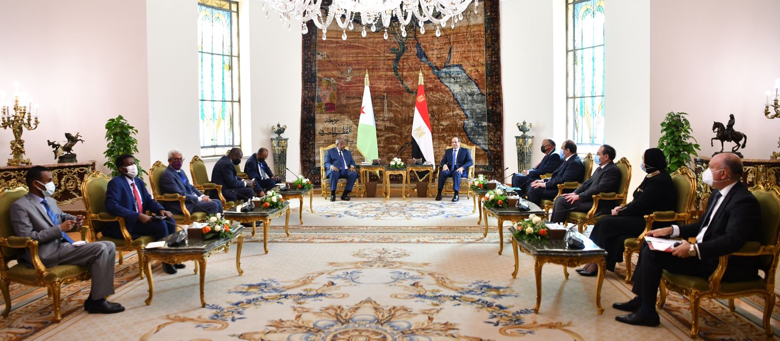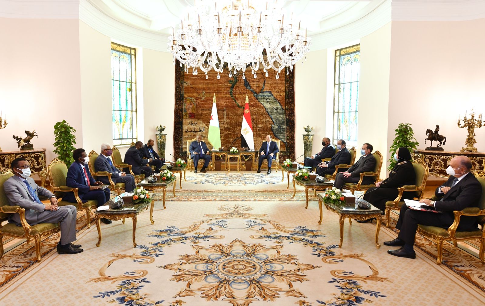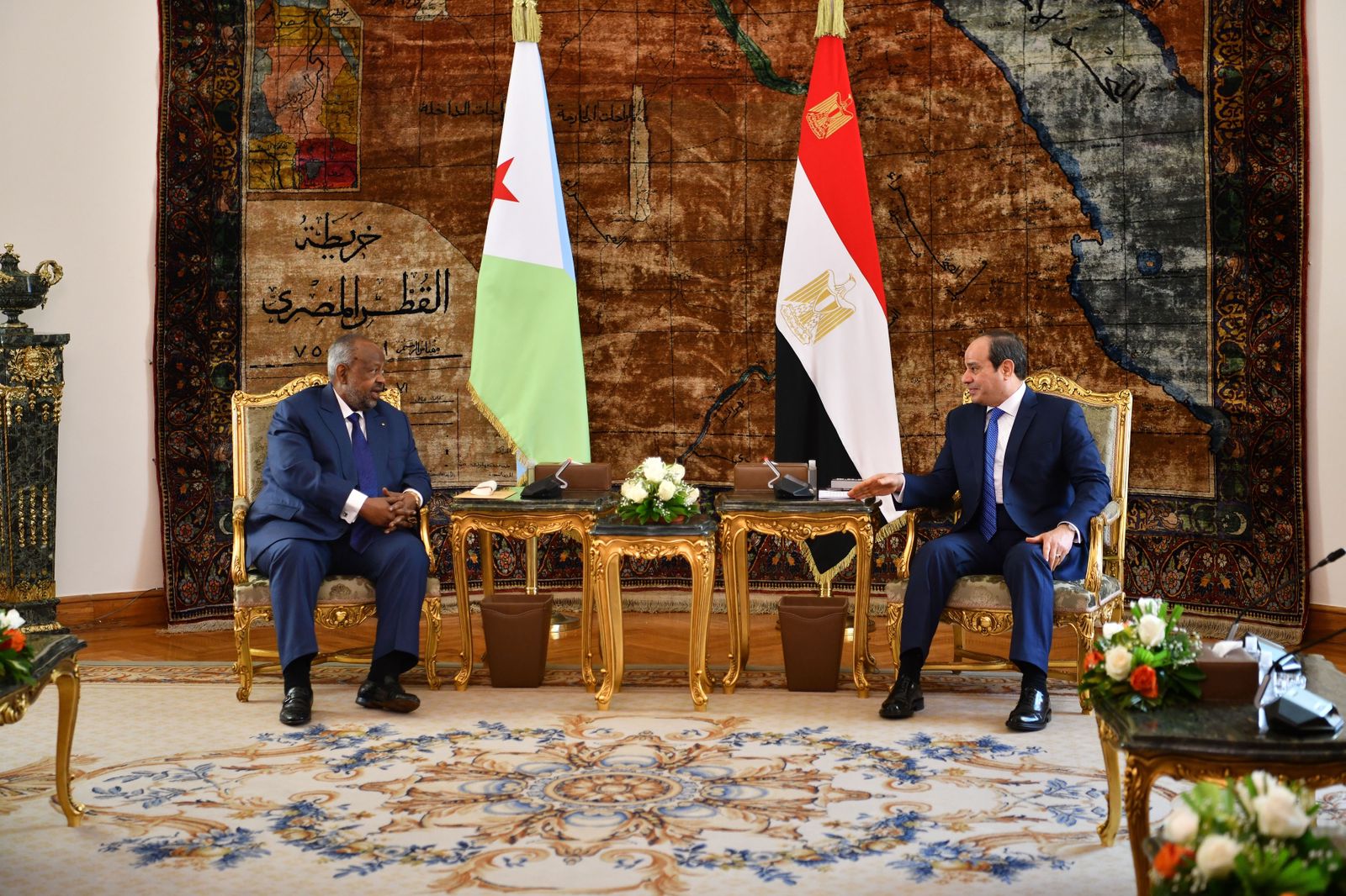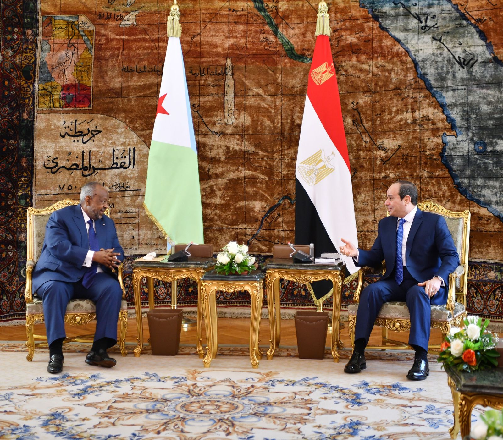 وقال السفير بسام راضي المتحدث الرسمي باسم رئاسة الجمهورية إن اللقاء شهد عقد مباحثات منفردة بين الرئيسين، أعقبتها مباحثات موسعة بحضور وفدي البلدين، حيث رحب الرئيس بزيارة أخيه الرئيس "جيله" إلى مصر، معربًا عن التقدير للعلاقات التاريخية الوثيقة والتعاون المشترك ووحدة الرؤى التي تربط بين البلدين الشقيقين، ومؤكدًا حرص مصر على تعزيز العلاقات وترسيخ التعاون الإستراتيجي مع جيبوتي في شتى المجالات لإقامة شراكة مستدامة بين البلدين، بما يعكس مزيدًا من التنسيق والتعاون فيما يتعلق بقضايا الأمن الإقليمي والعمل التكاملي لإرساء السلام والاستقرار في المنطقة.