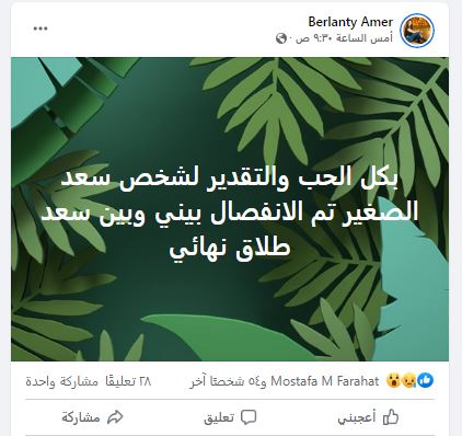 أثارت الفنانة الشابة برلنتي عامر، الجدل فى الساعات الماضية، بعدما أعلنت طلاقها بشكل نهائي من الفنان الشعبي سعد الصغير، من خلال حسابها الرسمي على موقع التواصل الاجتماعي “فيس بوك”.