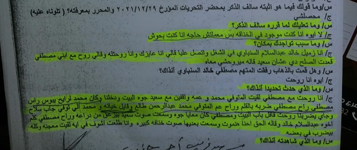 وأكمل اعترافاته قائلًا: "انا روحت مع مصطفى لقيت المتوفى محمد وعمه واقفين جوه البيت وكان محمد رايح يبوس دماغ مصطفى راح مصطفى ضربه بالقلم راح عم المتوفى خارج وقايل خيانة وبعد كده قامت خناقة وكله بيضرب في بعضه".
