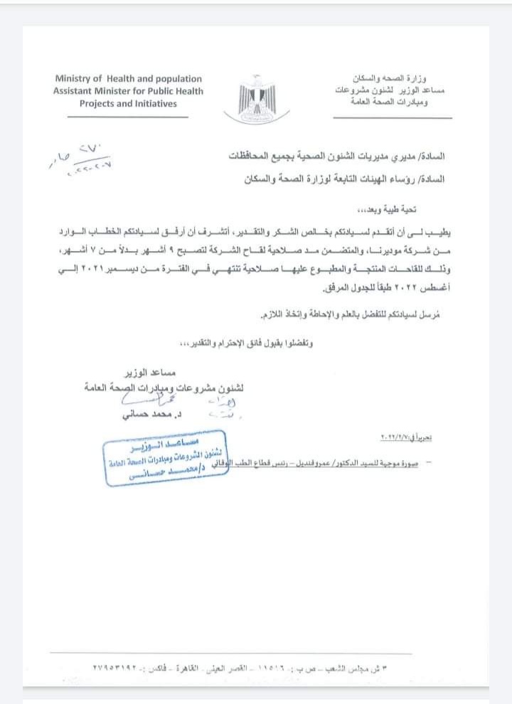 أصدرت وزارة الصحة تعليمات الي مديريات الصحة بالمحافظات وكذلك الهيئات التابعة لها بشأن مد صلاحية لقاح مودرنا المضاد لفيروس كورونا بناء علي خطاب صادر من شركة موديرنا المنتجة للقاح.