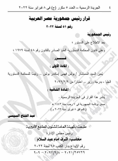 صدق الرئيس عبد الفتاح السيسي على تعيين المستشار بولس فهمي إسكندر بولس رئيسًا للمحكمة الدستورية.