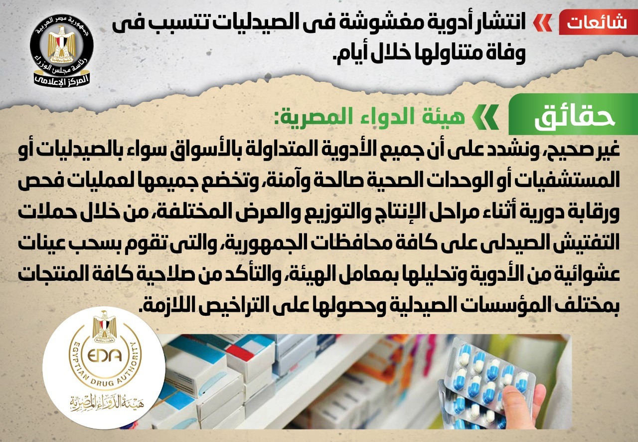 رصد المركز الإعلامي بمجلس الوزراء تداول أنباء بشأن انتشار أدوية مغشوشة في الصيدليات تتسبب في وفاة متناولها خلال أيام، وقد قام المركز الإعلامي لمجلس الوزراء بالتواصل مع هيئة الدواء المصرية، والتي نفت تلك الأنباء.