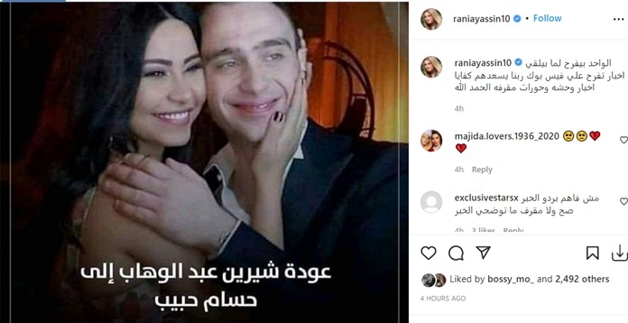 في نفس التوقيت أعلنت الإعلامية بسمة وهبة عودة الفنانة شيرين عبدالوهاب لزوجها حسام حبيب بعد شهرين من إعلان انفصالهما، وكتبت بسمة وهبة تعليقا على صورة للثنائي شيرين وحسام نشرتها عبر حسابها علي انستجرام: "كنت متأكدة إنها زوبعة فنجان وكنت متأكدة إن الاتنين بيعشقوا بعض".