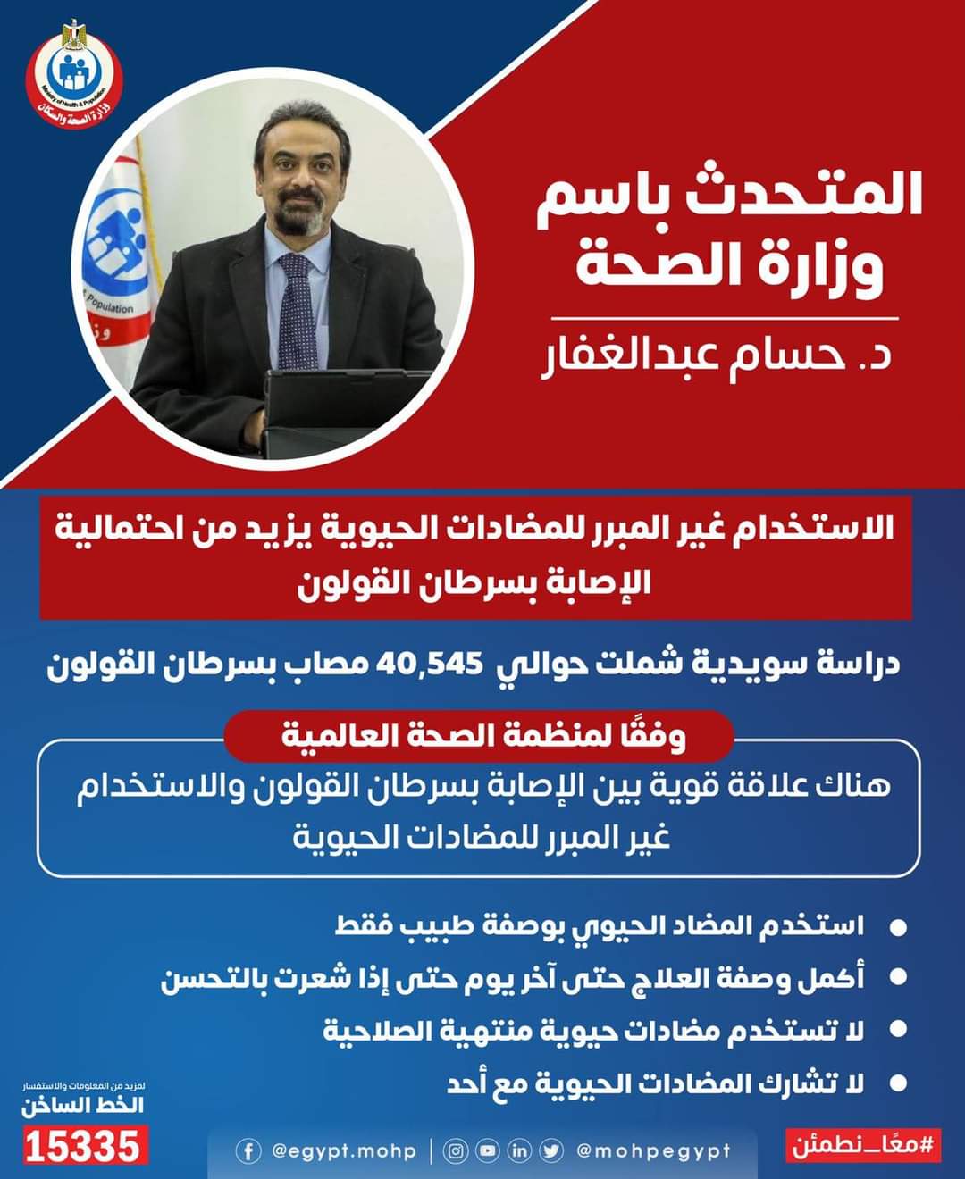 حذر الدكتور حسام عبد الغفار، المتحدث الرسمي باسم وزارة الصحة، من الاستخدام غير المبرر للمضادات الحيوية، نظرا لأن ذلك يزيد من احتمالية الإصابة بسرطان القولون وذلك وفقا لدراسة سويدية طبقت علي أكثر من ٤٠ الف مريض سرطان قولون