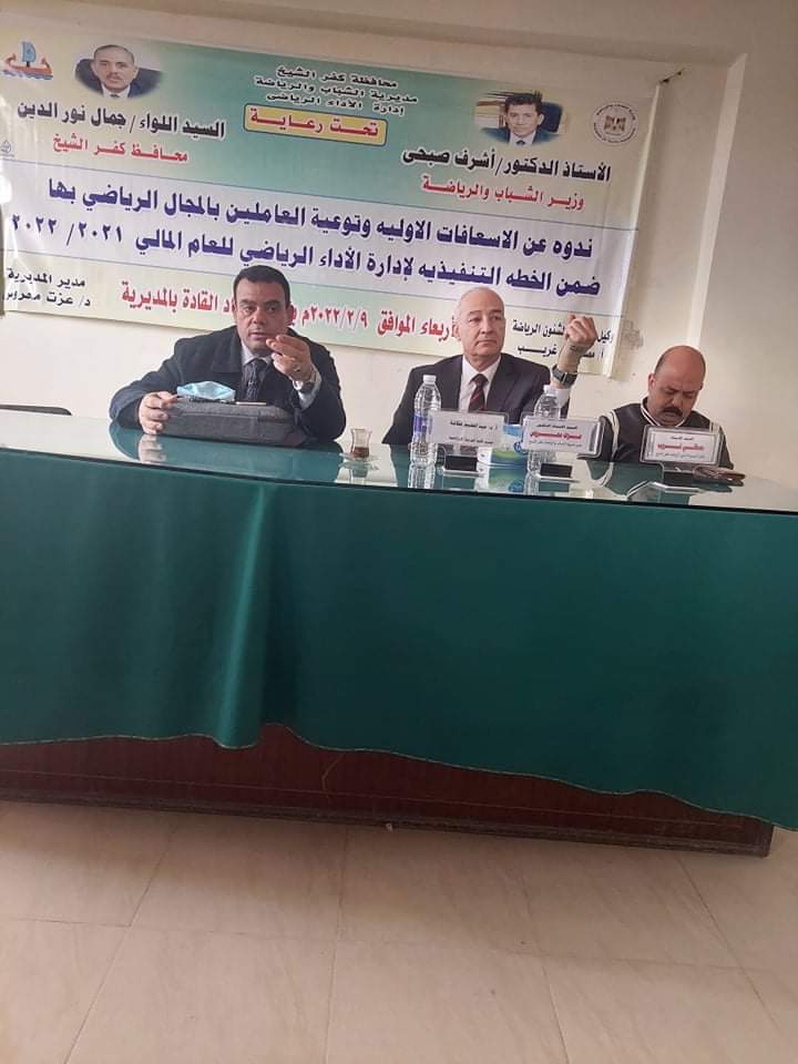 نظمت مديرية الشباب والرياضة بكفر الشيخ ندوة عن الإسعافات الأولية وإصابات الملاعب الرياضيه للمدربين والمشرفين الرياضيين بالأندية ومراكز الشباب التي تنفذ من خلال إدارة الأداء الرياضي، جاء ذلك برعاية الدكتور أشرف صبحى وزير الشباب والرياضة، وبحضور الدكتور عزت محروس مدير مديرية الشباب والرياضة بكفرالشيخ، ومصطفى غريب وكيل المديرية للرياضة، والدكتور جمال الشهاوي مدير ادارة الأداء الرياضي بالمديرية، والمشرفين الرياضيين بالأندية ومراكز الشباب بالمحافظة