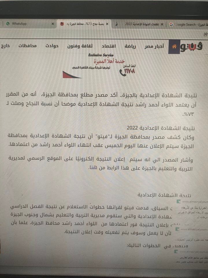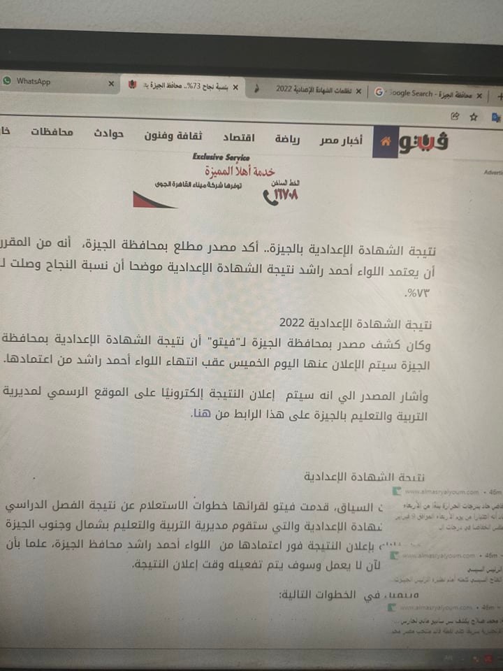وكانت فيتو انفردت أول أمس الثلاثاء بخبر موعد إعلان ظهور نتيجة الشهادة الإعدادية بالجيزة، كما انفردت بإعلانها ونسبة النجاح.