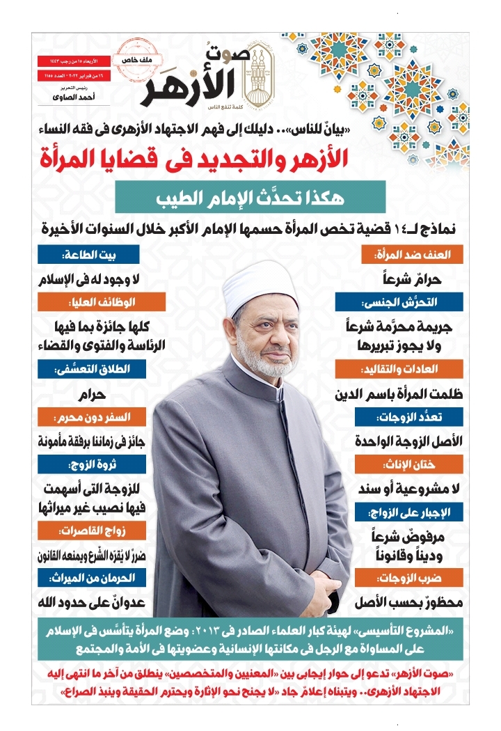 واعتمدت الجريدة فى ملفها على رؤية الإمام الأكبر د.أحمد الطيب، شيخ الأزهر، فى هذه المسائل؛ ومنها رفض وجود بيت الطاعة، وتحريم العنف ضد المرأة، ورفض إجبار المرأة على الزواج ممَّن لا ترغب، ورفض إعضالها بمنعها من الزواج من كفءٍ تُريده، وحظر ضرب الزوجات بالقانون، وجواز تولى المرأة الوظائف العليا جميعها متى امتلكت الكفاءة وشروط الوظيفة؛ ومنها الرئاسة والفتوى والقضاء.