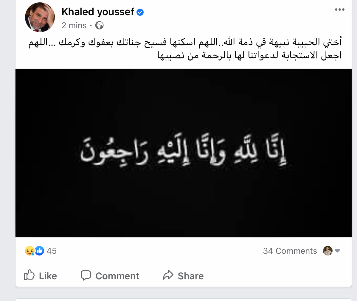 وكتب خالد عبر حسابه علي “فيس بوك ”: “أختي الحبيبة نبيهة في ذمة الله..اللهم اسكنها فسيح جناتك بعفوك وكرمك …اللهم اجعل الاستجابة لدعواتنا لها بالرحمة من نصيبها”.