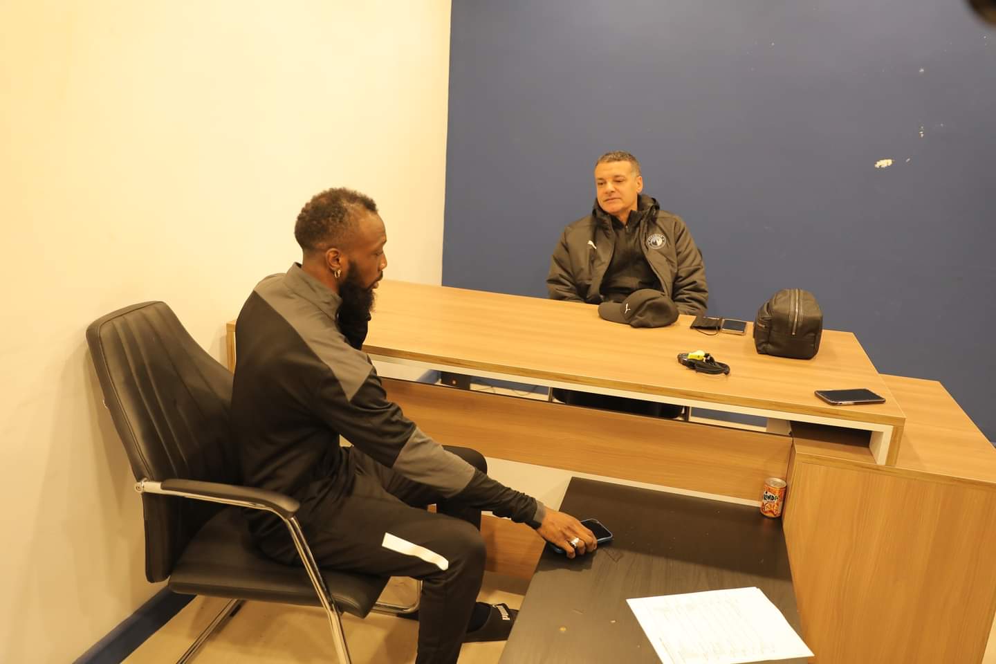 اجتمع إيهاب جلال المدير الفني لفريق بيراميدز بالنجم البوركيني إبراهيم توريه لاعب وسط الفريق الجديد قبل انضمامه لأول مرة لتدريبات الفريق بالدفاع الجوي.
