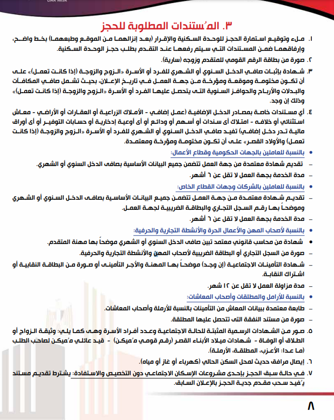 حددت وزارة الإسكان المستندات المطلوبة للتقديم على شقق دار مصر وجنة وسكن مصر فى الطرح الجديد، الذى أعلنت عنه الوزارة ويبداأ التقديم 15 فبراير الجاري، وهى شقق جاهزة للتسليم الفوري للمواطنين متوسطي الدخل، ضمن مبادرات البنك المركزي المصري المتنوعة للتمويل العقاري، التي وجه بها رئيس الجمهورية، بفائدة 3 % متناقصة و8 % متناقصة.