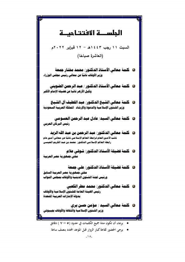 وتبدأ الفعاليات بكلمة لوزير الأوقاف الدكتور محمد مختار جمعة، فى الجلسة الافتتاحية، وتتضمن جهود مصر فى ترسيخ قيم المواطنة والتسامح والتعايش السلمى، وجهود وزارة الأوقاف المصرية فى تأهيل الأئمة والدعاة على فقه الواقع وقضايا الوطن، وضرورة إعلاء القيم الإنسانية والوطنية بين أبناء الوطن، كما يلقى وزير الشئون الإسلامية والدعوة والإرشاد بالمملكة العربية السعودية الشيخ الدكتور عبداللطيف بن عبدالعزيز آل الشيخ، كلمة فى افتتاح أعمال المؤتمر.