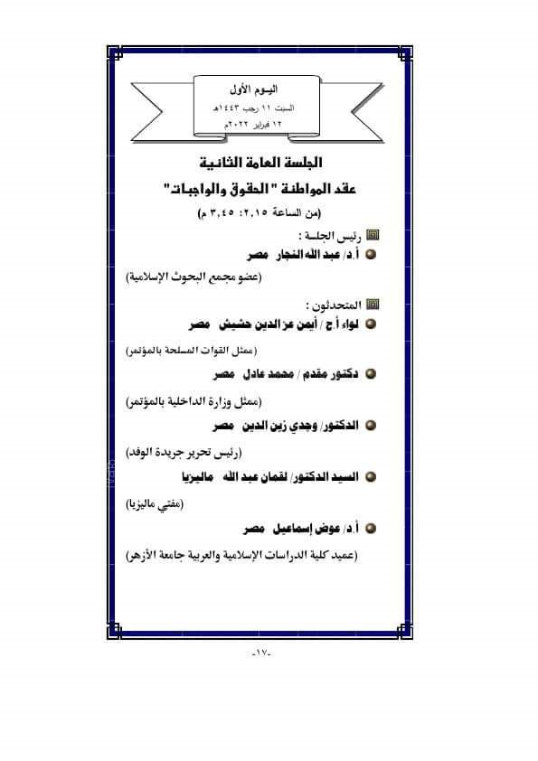 ويتضمن المؤتمر عدة محاور من بينها تطور مفهوم الدولة قديما وحديثا من منظور إنسانى، ومشروعية الدولة الوطنية، وضوابط عقد المواطنة، والمواطنة بين الحقوق والواجبات، والتسامح الدينى، ومكانة المرأة فى الدولة الوطنية، والمواطنة والحماية الاجتماعية، والمواطنة وأثرها فى تحقيق السلام العالمى.