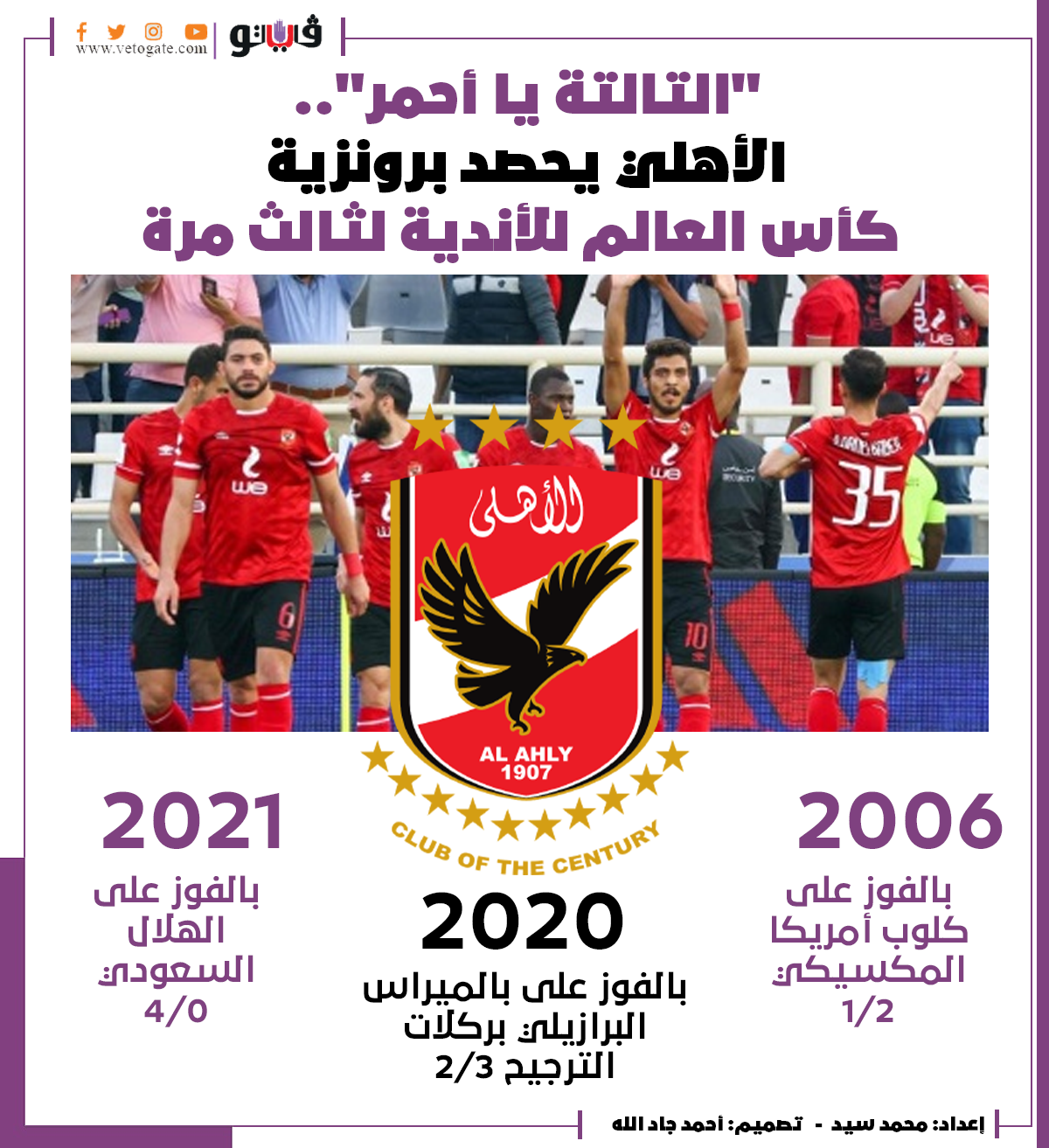"التالتة يا أحمر".. الأهلي يحصد برونزية كأس العالم للأندية لثالث مرة | انفوجراف السبت 12/فبراير/2022 - 07:19 م 2/12/2022 7:19:10 PM الأهلي محمد سيد شارك طباعة 18 حجم الخط شارك طباعة النادي الأهلي الأهلي كأس العالم للأندية الهلال السعودي الهلال