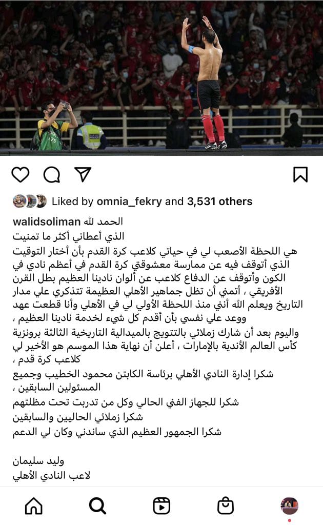 أعلن وليد سليمان لاعب الفريق الأول لكرة القدم بالنادي الأهلي اعتزاله كرة القدم بعد نهاية الموسم الحالي.