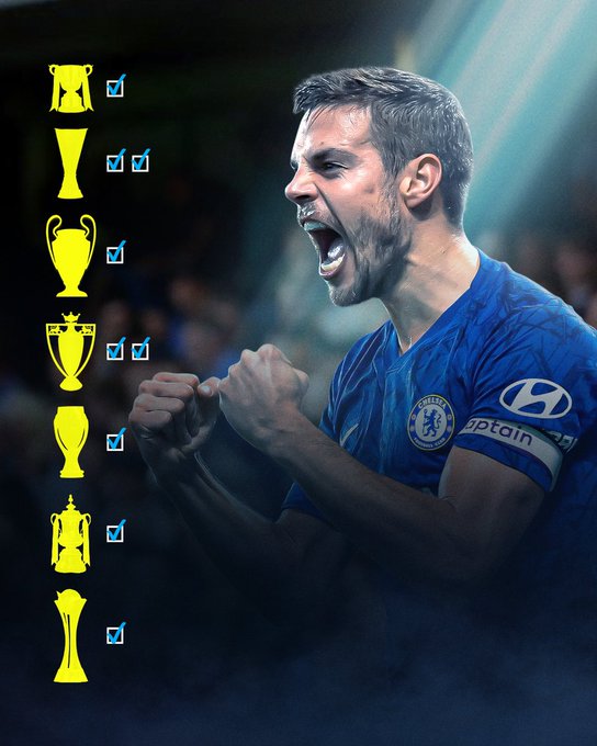وأصبح سيزار أزبيليكويتا أول لاعب في تاريخ تشيلسي يتوج بتلك الألقاب، البريميرليج، ودوري أبطال أوروبا، والدوري الأوروبي، وكأس الاتحاد الإنجليزي وكأس رابطة المحترفين، إضافة إلى السوبر الأوروبي.