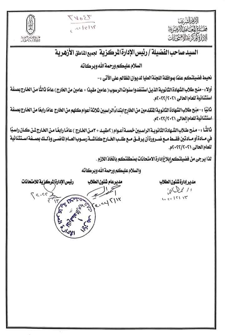 1 - منح طلاب الثانوية الأزهرية اللذين استنفذوا سنوات الرسوب ( عامين مقيد /عامين من الخارج) عامآ ثالثآ من الخارج بصفة استثنائية للعام الدراسي الحالي 2022/2021