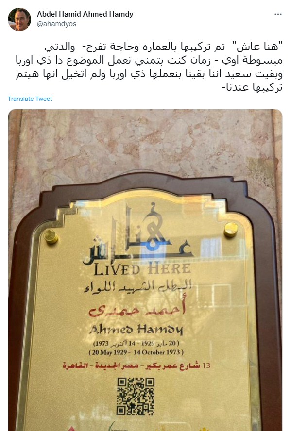 وكتب عبد الحميد أحمد حمدي تغريدة على تويتر "هنا عاش" تم تركيبها بالعمارة وحاجة تفرح- والدتي مبسوطة اوي - زمان كنت بتمني نعمل الموضوع دا ذي اوربا وبقيت سعيد اننا بقينا بنعملها ذي اوربا ولم اتخيل انها هيتم تركيبها عندنا"
