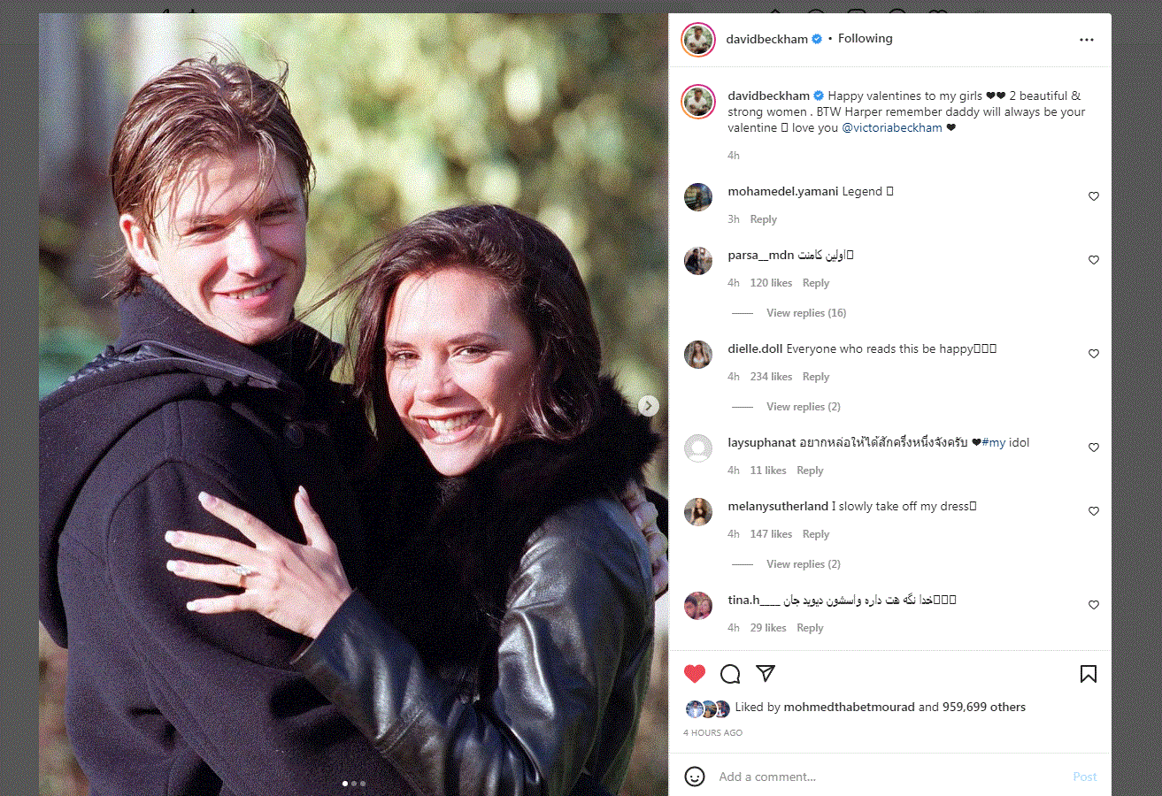 ونشر ديفيد بيكهام العديد من الصور له وأسرته معا من أوقات مختلفة معلقا:"عيد حب سعيد لفتياتي امرأتان جميلتان وقويتان..هاربر تذكري أن الأب سيكون دائمًا عيد الحب الخاص بك..أحبك "