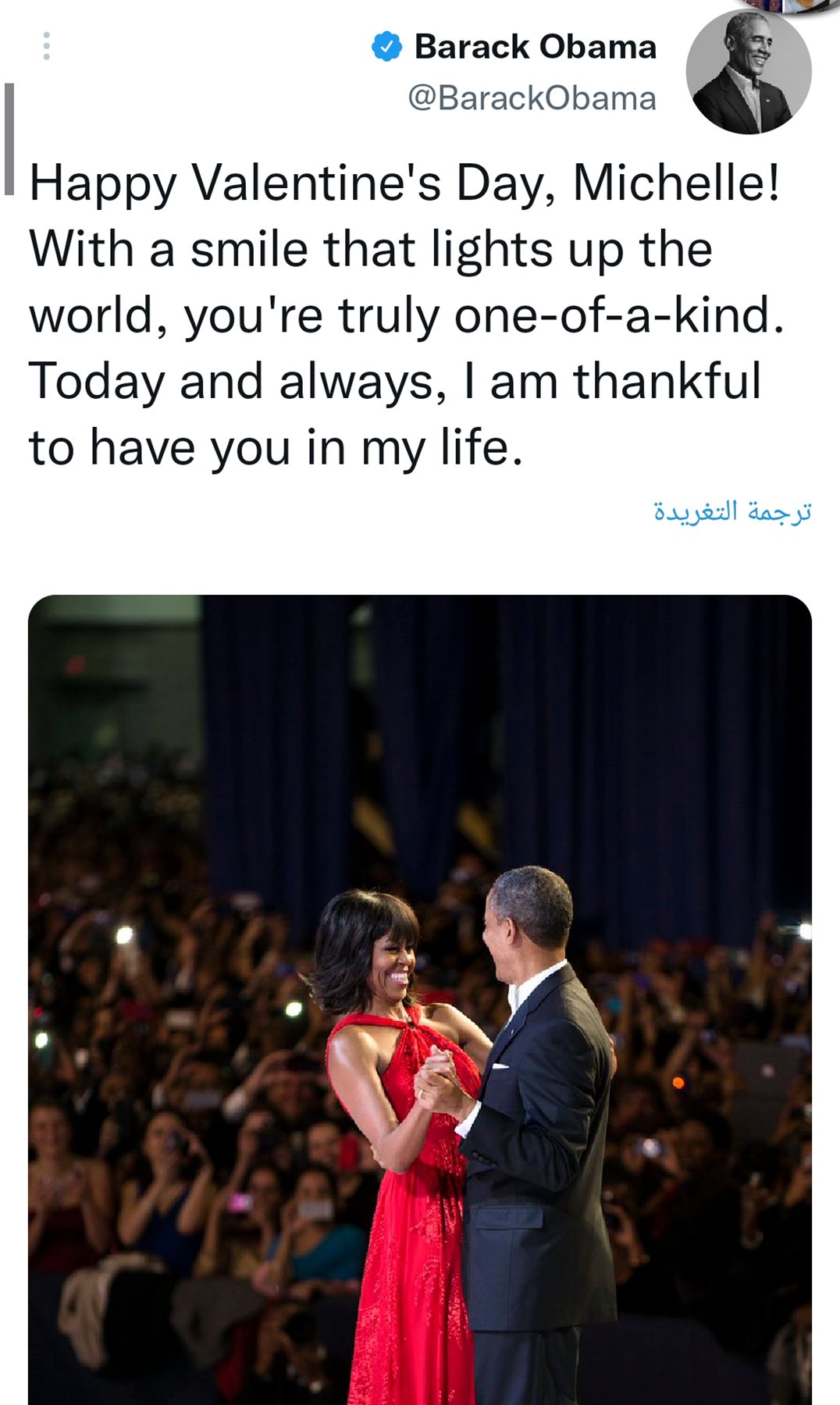 ونشر أوباما صورة تجمعه مع زوجته، عبر حسابه الرسمي على موقع التدوينات القصيرة تويتر، قائلًا: "عيد حب سعيد يا ميشيل… ابتسامتك تضيء العالم، أنتِ حقًَّا امرأة فريدة من نوعك، وأنا ممتن بوجودك في حياتي".