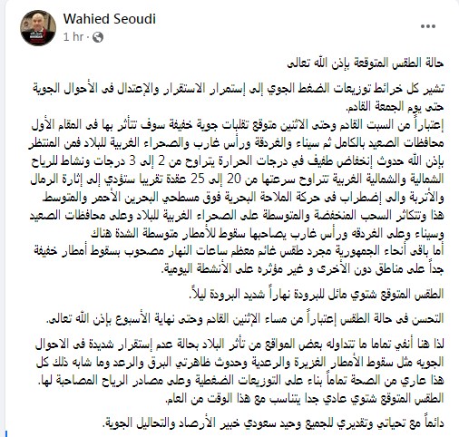 وكتب وحيد سعودي تدوينة على الفيس بوك: "حالة الطقس المتوقعة بإذن الله تعالى.. تشير كل خرائط توزيعات الضغط الجوي إلى استمرار الاستقرار والاعتدال في الأحوال الجوية حتى يوم الجمعة القادم"