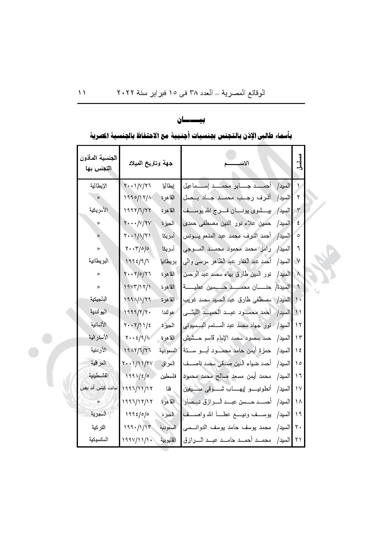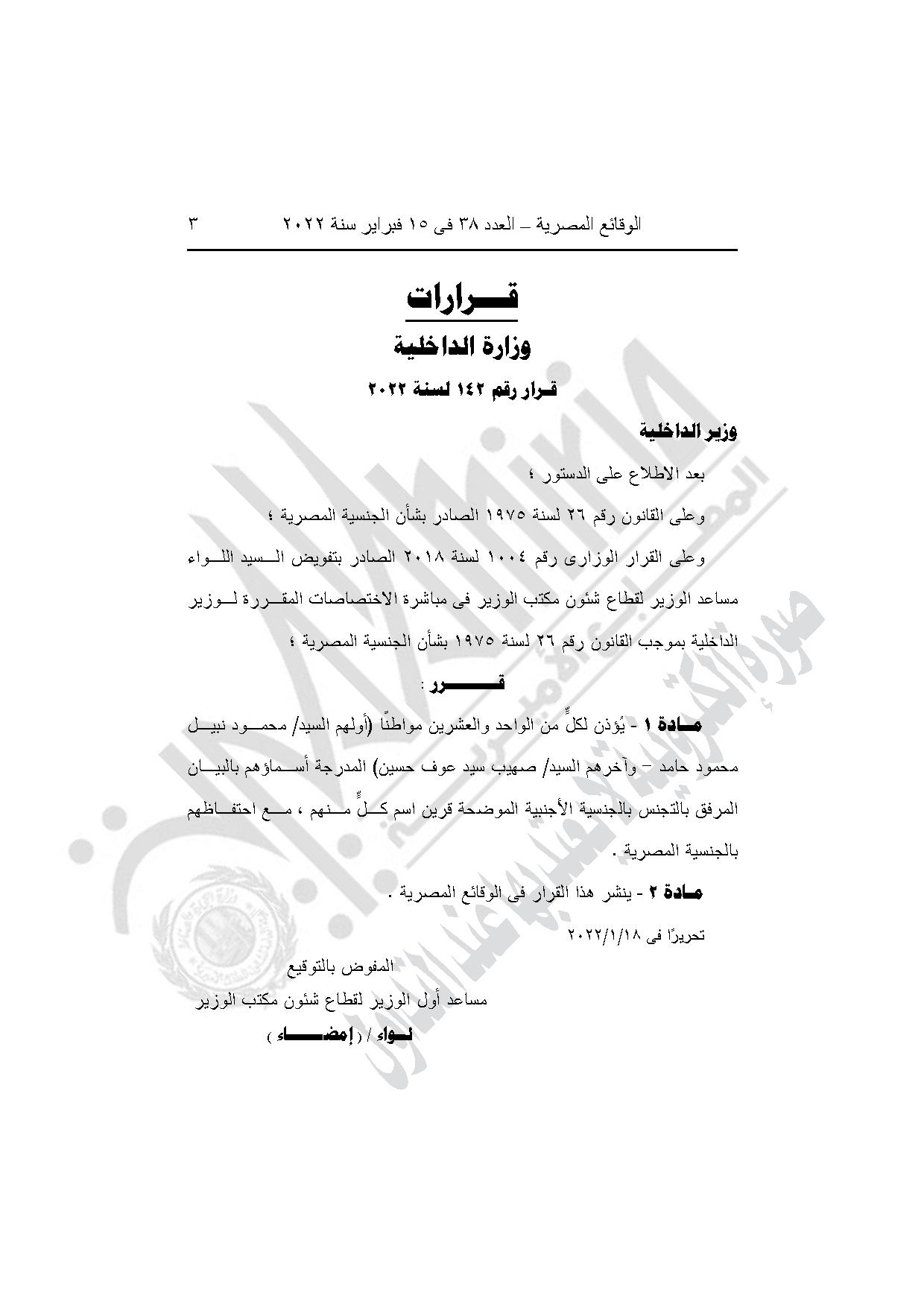 القرار رقم 142 لسنة 2022، بالإذن لكل من الواحد والعشرين مواطنًا (أولهم محمود نبيل محمود حامد، وآخرهم صهيب سيد عوف حسين) المدرجة اسماؤهم بالبيان، بالتجنس بالجنسية الأجنبية، الموضحة قرين اسم كل منهم، مع احتفاظهم بالجنسية المصرية.