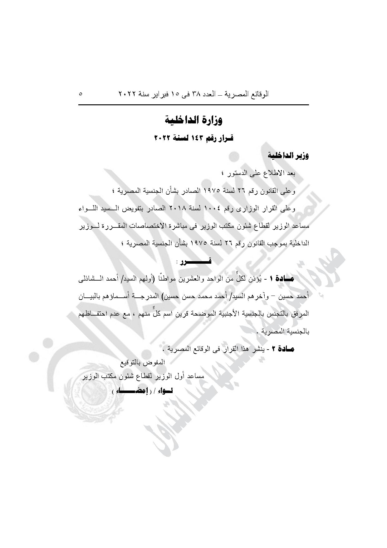 والقرار رقم 143 لسنة 2022، بالإذن لكل من الواحد والعشرين مواطنًا (أولهم أحمد الشاذلي أحمد حسين، وآخرهم أحمد محمد حسن حسين) المدرجة اسماؤهم بالبيان، بالتجنس بالجنسية الأجنبية، الموضحة قرين اسم كل منهم، مع عدم احتفاظهم بالجنسية المصرية.