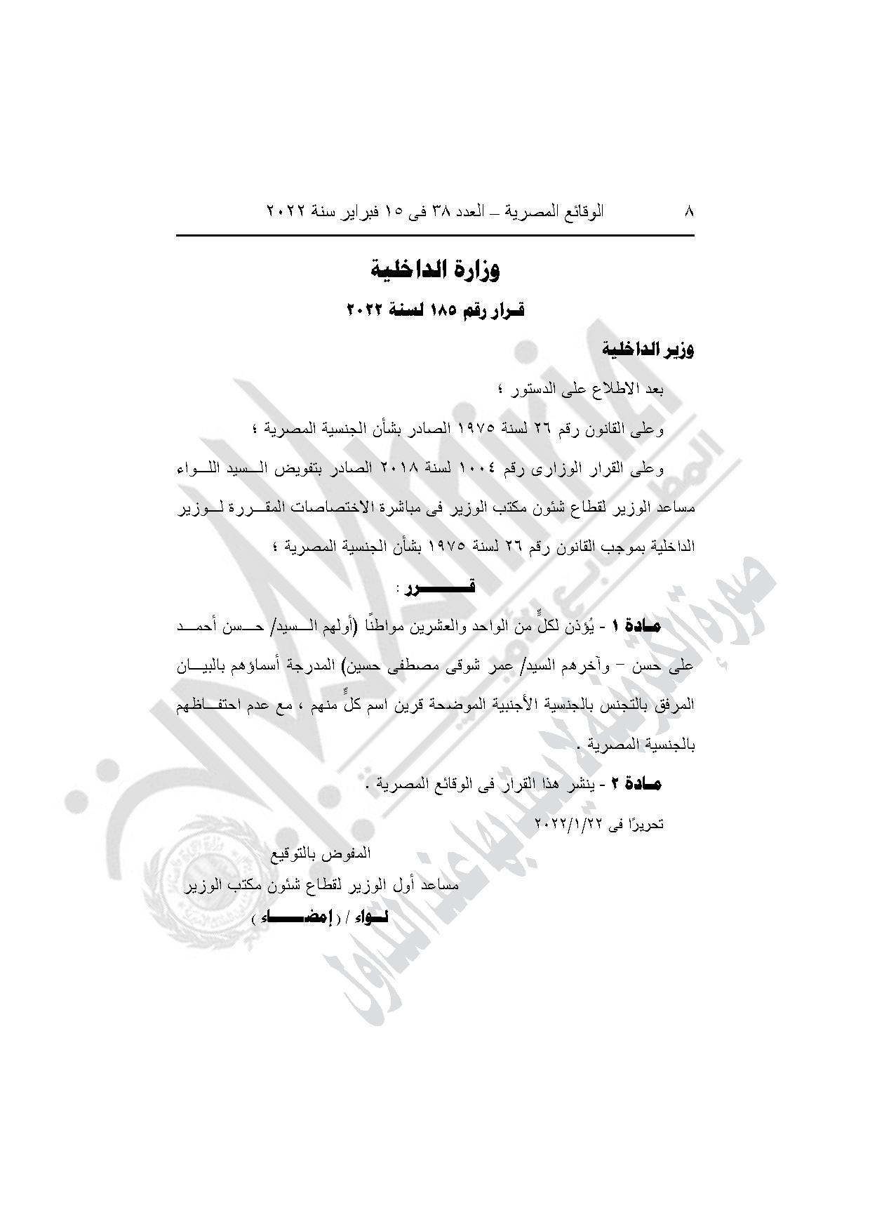 والقرار رقم 185 لسنة 2022، بالإذن لكل من الواحد والعشرين مواطنًا (أولهم حسن أحمد علي حسن، وآخرهم عمر شوقي مصطفى حسين) المدرجة اسماؤهم بالبيان، بالتجنس بالجنسية الأجنبية، الموضحة قرين اسم كل منهم، مع عدم احتفاظهم بالجنسية المصرية.