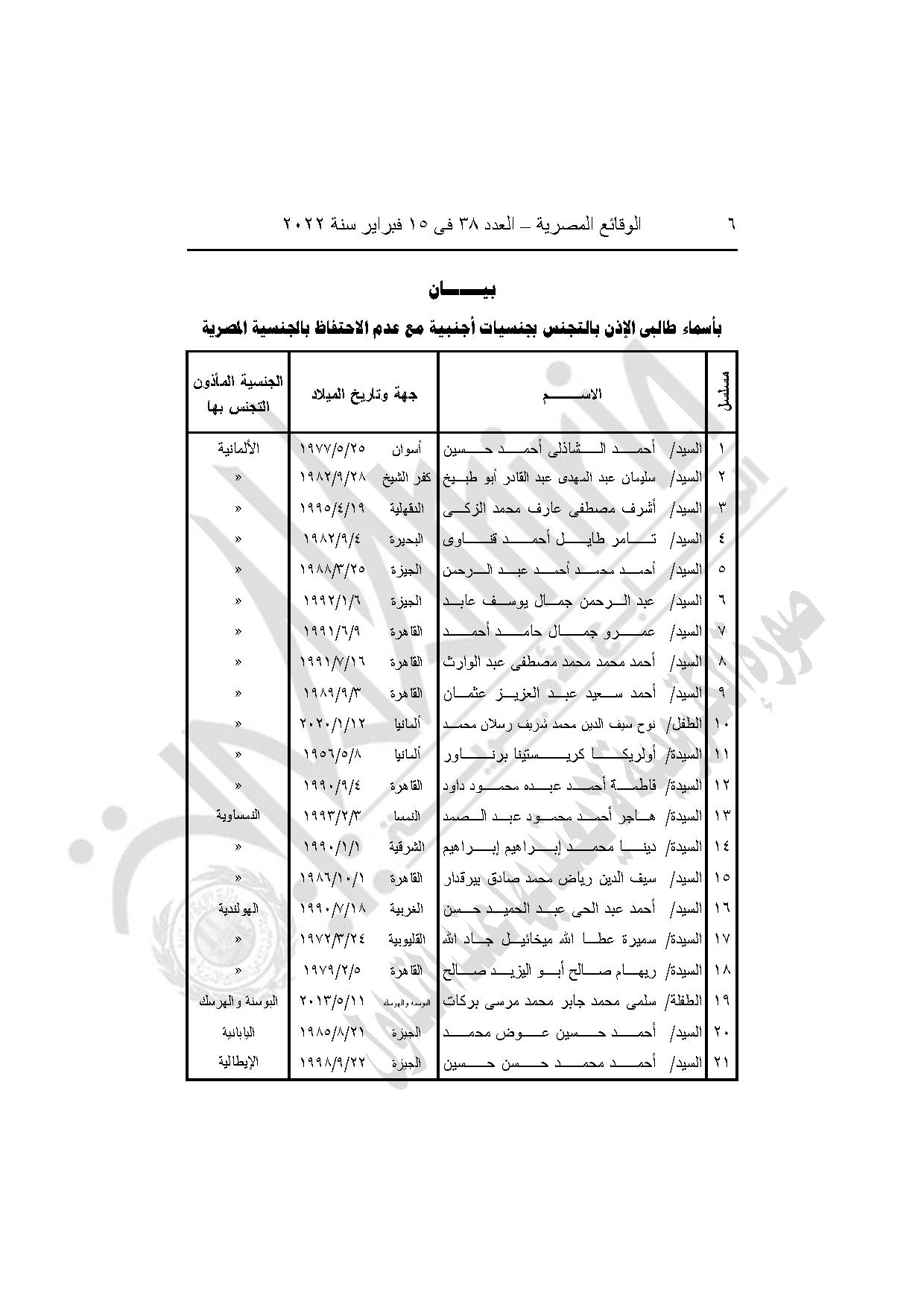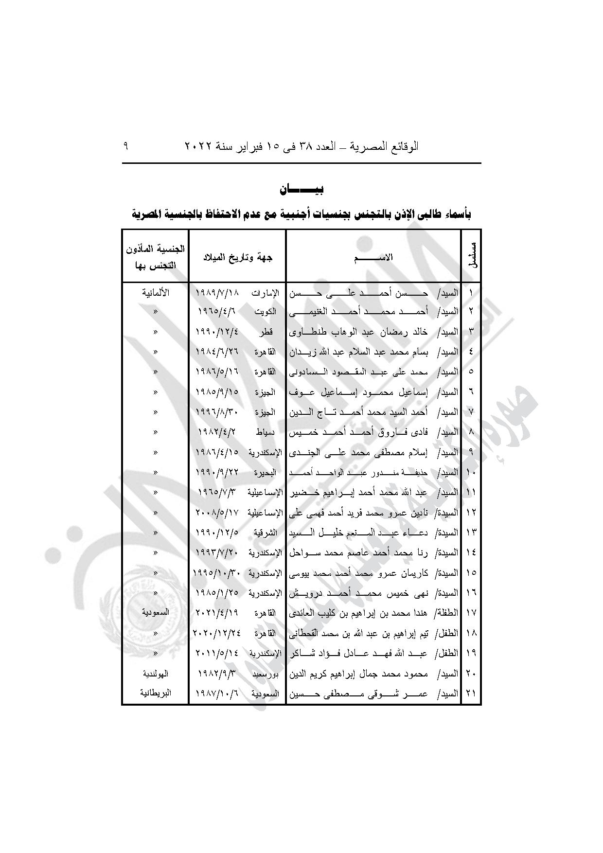 نشرت جريدة الوقائع المصرية في عددها رقم 38، الصادر في 15 فبراير 2022، قرارات وزارة الداخلية، بشأن سحب الجنسية المصرية من 42 مواطنًا، وإبعاد سوري عن البلاد، ورفض منح فلسطيني الجنسية المصرية، والإذن لـ 42 مواطنا التجنس بالجنسية الأجنبية، مع احتفاظهم بالجنسية المصرية.