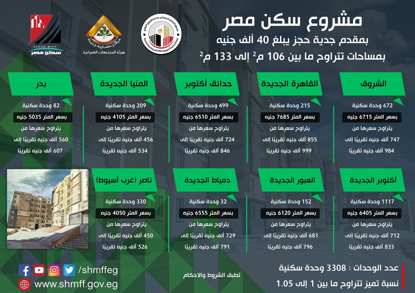 والتقديم عبر الموقع الإلكتروني الجديد للصندوق على الرابط هنا، وذلك ضمن مُبادرة رئيس الجمهورية لتوفير وحدات سكنية لكافة فئات المواطنين بتيسيرات خاصة من البنك المركزي المصري وذلك في ضوء مباردته للتمويل العقاري لمتوسطي الدخل بفائدة 3% متناقصة لمدة حدها الأقصي 30 سنة وفائدة 8% متناقصة لمدة حدها الأقصى 25 سنة.