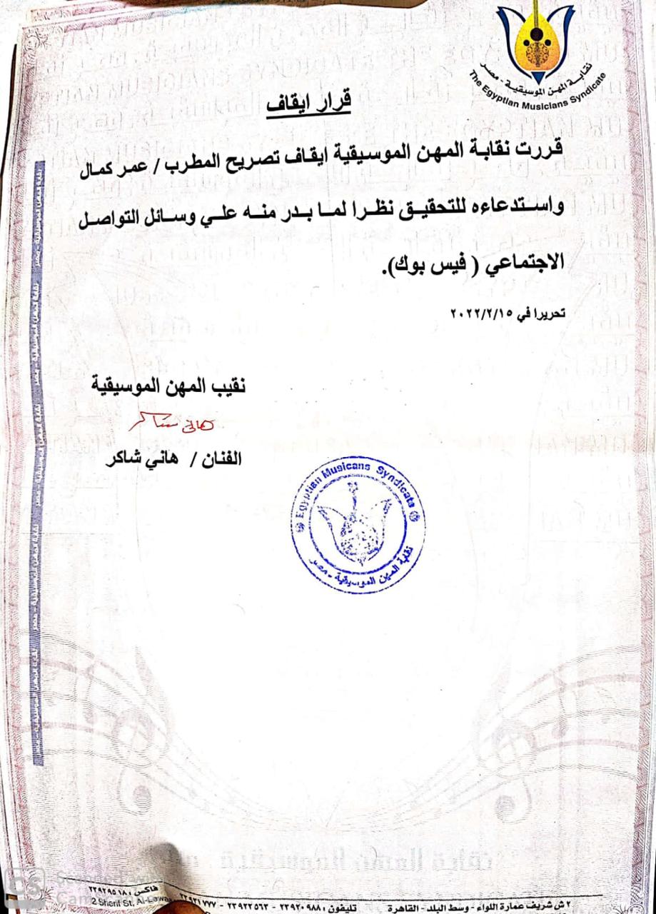 أصدرت نقابة المهن الموسيقية، رسميًّا قرار إيقاف المطرب الشاب عمر كمال عن الغناء، بسبب تصريحاته الأخيرة على مواقع التواصل الاجتماعي “فيس بوك”.