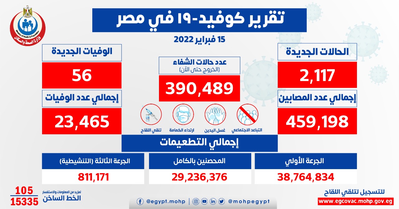 وأوضح الدكتور حسام عبد الغفار المتحدث الرسمي لوزارة الصحة والسكان، أنه تم تسجيل 2117 حالة جديدة ثبتت إيجابية تحاليلها للفيروس ومتحوراته، وذلك ضمن إجراءات الترصد والتقصي والفحوصات اللازمة التي تُجريها الوزارة وفقًا لإرشادات منظمة الصحة العالمية، لافتًا إلى وفاة 56 حالة جديدة.