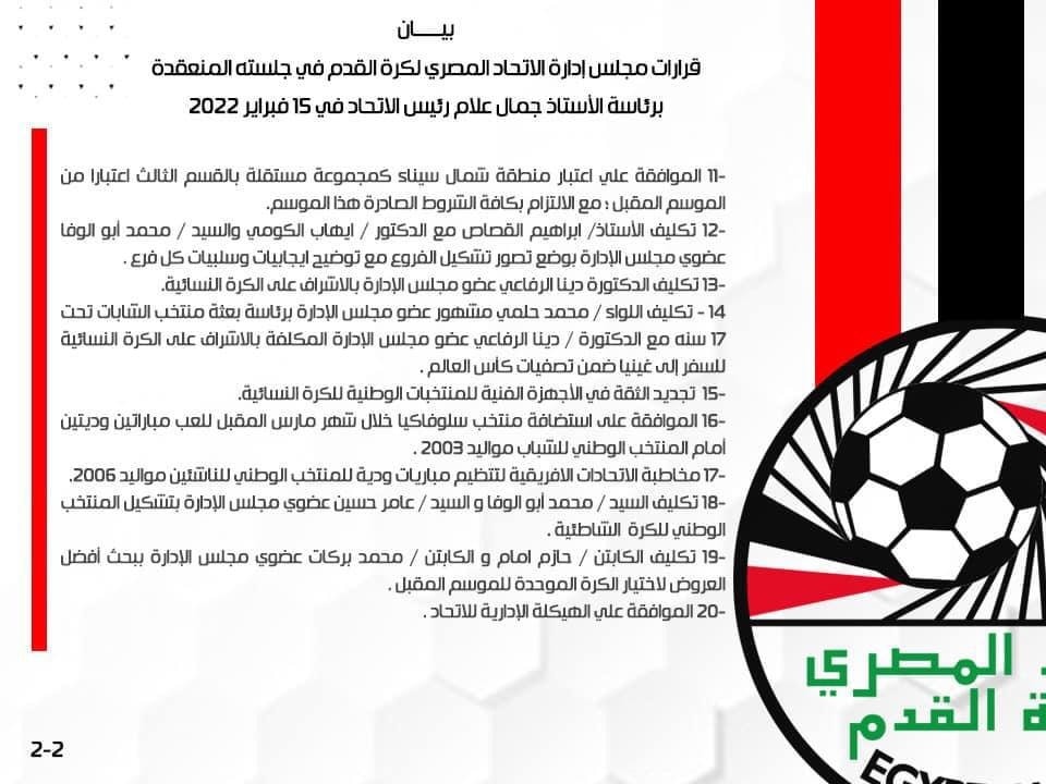 وقرر اتحاد الكرة، توجيه الشكر للجهاز الفني للمنتخب الأوليمبي بقيادة شوقي غريب، وجهاز كرة الصالات رغبة في توفير النفقات وعدم وجود ارتباط حتى 2023.