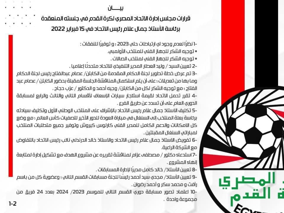وقرر اتحاد الكرة أيضا اختيار جمال علام مشرفًا على المنتخب الأول خلال الفترة المقبلة.
