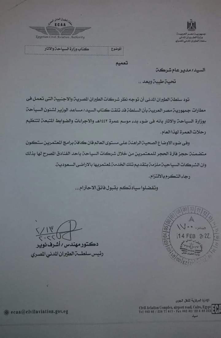 وأكدت سلطة الطيران المدني في خطابها لشركات السياحة واليذ حصلت “فيتو” علي نسخة منه، أن كافة برامج العمرة ستكون متضمنة فترة حجر صحي في المملكة العربية السعودية تقوم بها شركات السياحة بأحد الفنادق المصرح لها بذلك وان شركات السياحة ملزمة بتقديم تلك الخدمة لمعتمريها بالأراضي السعودية، وذلك في إطار الاستعدادات الجارية لبدء موسم العمرة.