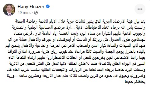 وكتب الدكتور هاني الناظر تدوينة على الفيس بوك "بعد بيان هيئة الارصاد الجوية الذي يشير لتقلبات جوية خلال الأيام القادمة وخاصة الجمعة والسبت بإذن الله برجاء اتخاذ الاحتياطات الآتية …اولا مرضى الحساسية الجلدية والصدرية والجيوب الأنفية عليهم اعتبارا من مساء اليوم ولمدة الخمسة ايام القادمة تناول قرص مضاد للهستامين طويل المفعول مثل زيرتك او تلفاست أو ليفوهستام او غيرهم والاطفال معلقة من اي منهم".
