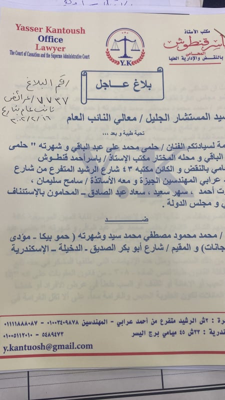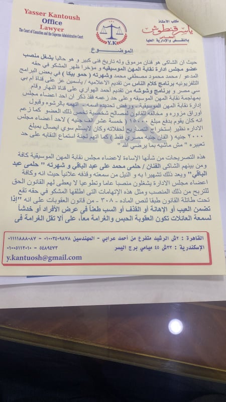 وتابع: هذه التصريحات من شأنها الإساءة لأعضاء مجلس نقابة المهن الموسيقية كافة ومن بينهم الشاكى الفنان حلمى محمد على عبد الباقى وشهرته حلمى عبد الباقى.. ويعد ذلك تشهيرا به والنيل من سمعته وقذفه علانيا.