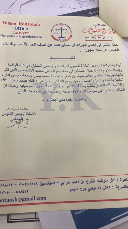 وأضاف البلاغ: على حد زعمه فقد ذكر أن أحد أعضاء مجلس إدارة نقابة المهن الموسيقية ورفض تحديد اسمه، اتهمه بالرشوة وقبول أوراق مزورة ومخالفة للقانون لمصالح شخصية تخص ذلك العضو كما زعم أنه يدفع مبلغ 15 ألف جنيه لأحد أعضاء مجلس الإدارة نظير استخراج التصاريح لحفلاته، وكان لا يستلم سوى إيصال بمبلغ 2000 جنيه، كما أتهم لجنة استماع النقابة على حد تعبيره "مش ماشية بما يرضى الله".
