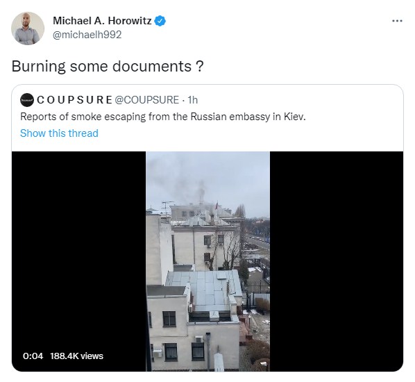 وتفاعل نشطاء مواقع التواصل الاجتماعي مع الفيديو، الذي أظهر تصاعد الدخان من داخل مقر السفارة الروسية في كييف، وهنا علق مايكل هورويتز، المحلل الجيوسياسي والأمني في "لو بيك إنترناشونال"، قائلًا: "أنهم يحرقون بعض الوثائق".