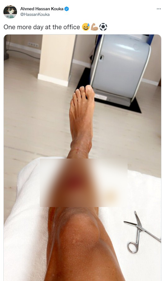 أعلن اللاعب المصري الدولي المحترف في تركيا أحمد حسن كوكا، عن إصابته في رجله، وكشف ذلك من خلال صورة لإصابته بجرح في رجله، ونشرها على حسابه بموقع التواصل الاجتماعي تويتر.