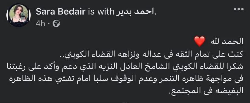 وكتبت سارة بدير منشورًا عبر حسابه الشخصي بموقع التواصل الاجتماعي فيسبوك، وقالت: الحمد لله.. كنت على تمام الثقة في عدالة ونزاهة القضاء الكويتي.. شكرا للقضاء الكويتي الشامخ العادل النزيه الذي دعم وأكد على رغبتنا في مواجهة ظاهرة التنمر وعدم الوقوف سلبا أمام تفشي هذه الظاهرة البغيضة في المجتمع.