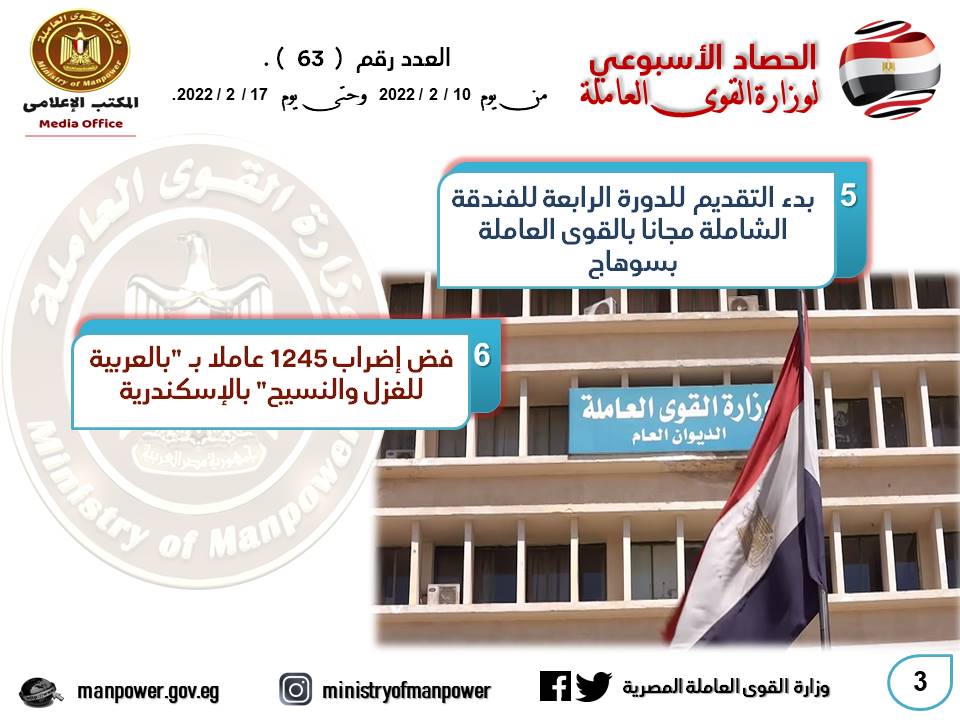 وفيما يلي تفاصيل ما جاء بالحصاد الأسبوعي، حيث أعلن وزير القوى العاملة محمد سعفان، أن الوزارة تعكف حاليًا على تجهيز خمس وحدات تدريب متنقلة تمهيدًا لاطلاقها بالقرى والنجوع بالمحافظات، وذلك على مهن جديدة لصيانة الحاسب الآلي، والمحمول، والدش، مشيرا إلي أنه بذلك يصبح وحدات التدريب المتنقلة 32 وحدة تغطي جميع محافظات الجمهورية لتنفيذ دورات تدريبية مجانية بدون أى مقابل فى القرى الأكثر احتياجا ضمن المبادرة الرئاسية "حياة كريمة" التي أطلقها الرئيس عبد الفتاح السيسي، فضلا عن زيادة 3 وحدات تدريب ثابتة في محافظتي قنا وأسوان لتصبح 10 وحدات ثابتة، ويتم التدريب فيها على 49 مهنة في المراكز الثابتة.