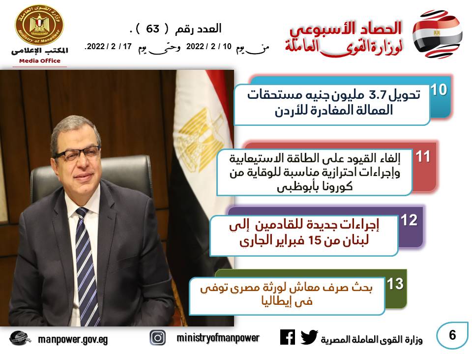 وامتد الحصاد ليشمل، أعلن وزير القوى العاملة، أن مكتب التمثيل العمالي التابع للوزارة بالسفارة المصرية بعمان-الأردن، استطاع بالمتابعة اللحظية والجهود المبذولة والمقابلات مع المسئولين بمؤسسة الضمان الاجتماعي بالأردن، واستكمالا لما تم تحويله سابقا، تم تحويل القائمة الـ 68 من مستحقات الضمان الاجتماعي لنحو 83 عامل مصري لدى المؤسسة غادروا عمان نهائيا.