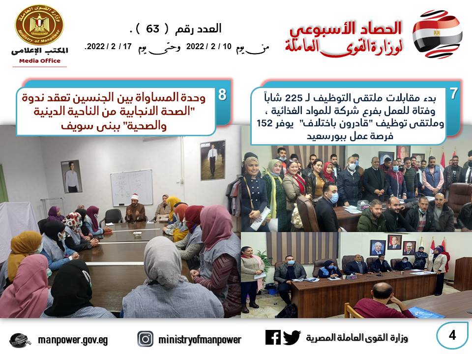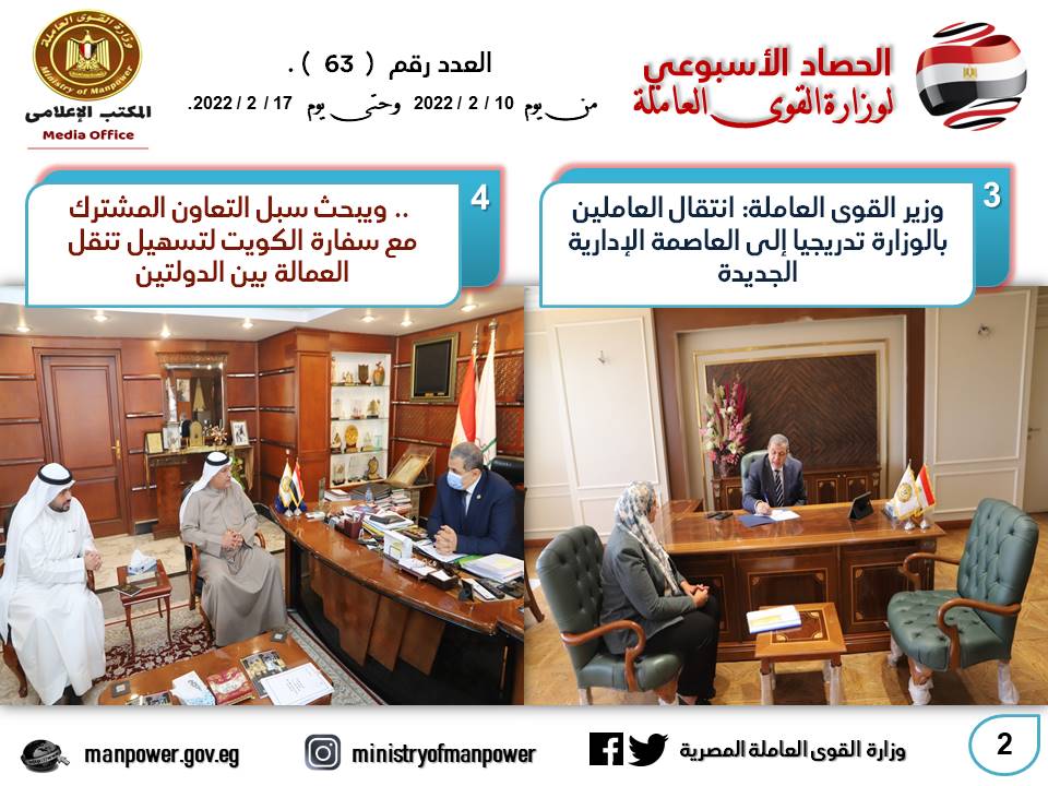 ويبحث سبل التعاون المشترك مع سفارة الكويت لتسهيل تنقل العمالة بين الدولتين، وتعيين 6141 شاب منهم 40 " قادرون باختلاف" في 6 محافظات، وبدء التقديم للدورة الرابعة للفندقة الشاملة مجانا بالقوى العاملة بسوهاج، وبدء مقابلات ملتقى التوظيف لـ 225 شابًا وفتاة للعمل بفرع شركة للمواد الغذائية وملتقى توظيف "قادرون باختلاف" يوفر 152 فرصة عمل في بورسعيد، وتحويل 3.7 مليون جنيه مستحقات العمالة المغادرة للأردن .