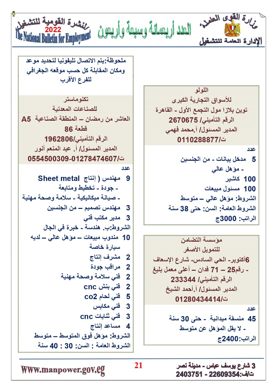 وفى الدقهلية: 5 مدير فرع، و4 نائب مدير، و6 مشرف مبيعات، و15 صراف، و40 ممثل بيع، و3 امين مخزن، و15 فرد أمن، و20 عامل مخزن، و5 عمال خدمات، و4 سائق رخصة اولى .