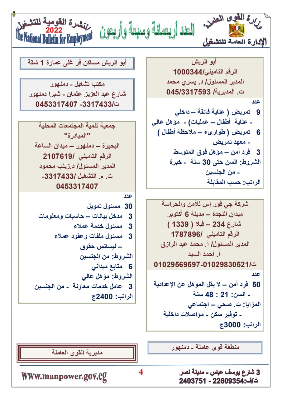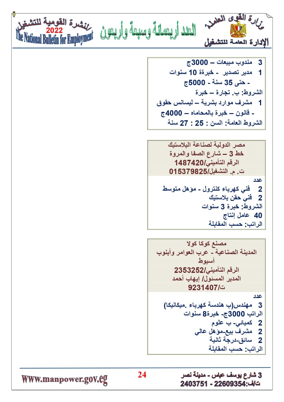 وفي أسيوط مطلوب: 5 صيدلي، و5 مساعد صيدلي، ونائب مدير فرع، و203 فرد أمن، و15 أخصائي قروض، و5 كاشير، و3 موظف ممر، و2 خدمة عملاء، و2 أمين مخزن، و5 ويتر، و2 استيور، و43 عامل عادي، و2 ميكانيكي، و2 كهربائي، و15 نساج، و15 عامل تعبئة وتغليف .