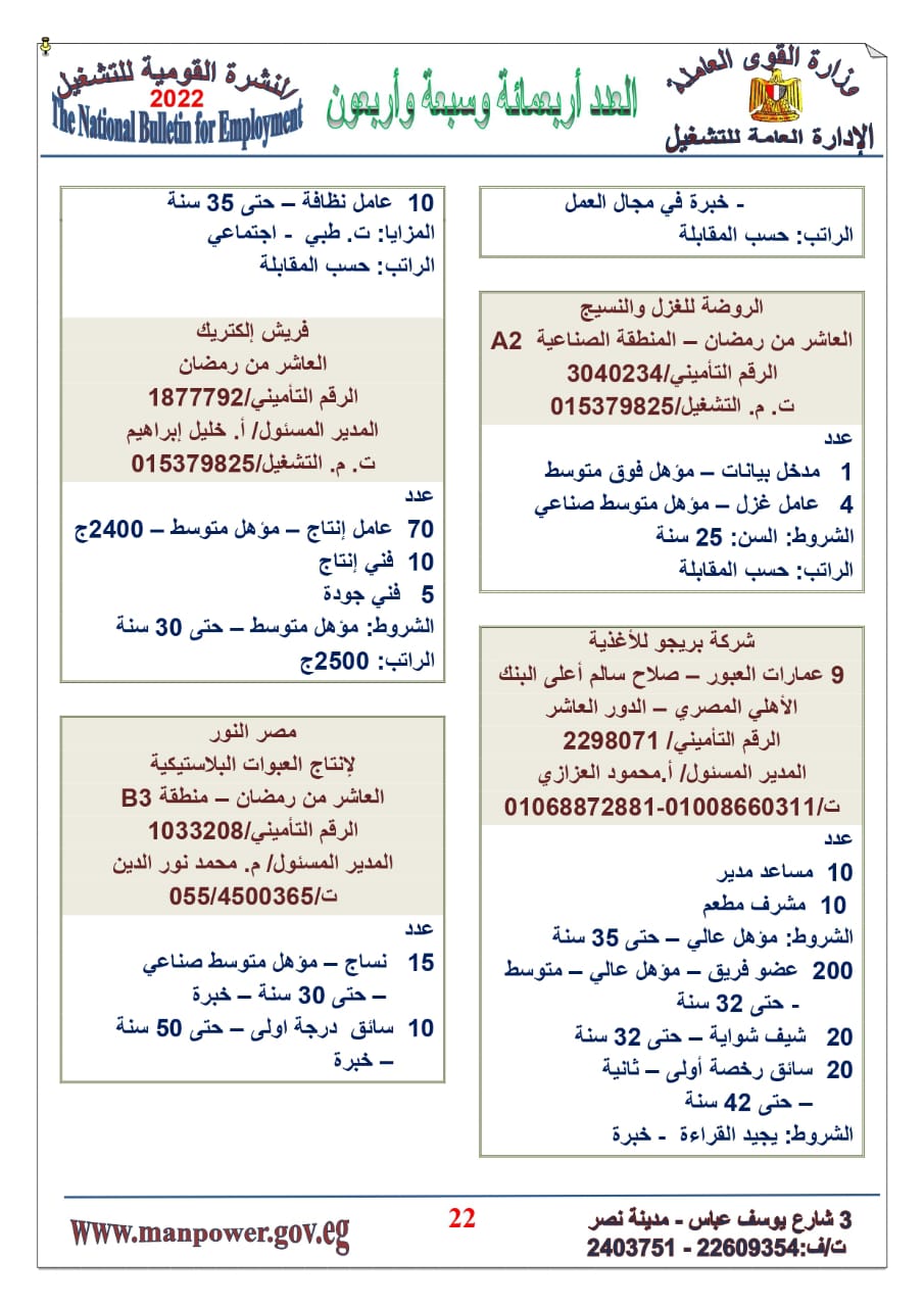 وفي الإسماعيلية مطلوب: 3 مدير قسم تعبئة، و50 خياط ( اورليه – اوفر – سنجر )، و10 مراقب جودة، و10 عمال مكواة، و20 عامل فرد وقص وترقيم، و10 فنى طباعة وتطريز، و10 مشرف خط إنتاج، ومدخل بيانات ومنسق مشروعات و 10 عمال تشطيب، و10 عمال تعبئة، و5 عمال انتاج، وعامل بوفيه، وفنى صيانة ميكانيكا .
