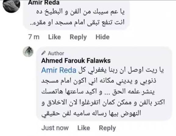 وكتب أحمد فلوكس في التعليقات عبر حسابه الشخصي بموقع التواصل الاجتماعي فيس بوك: ياريت أوصل إن ربنا يغفر لي كل ذنوبي ويديني مكانة إني أكون إمام مسجد ينشر علمه الحق، وأكيد ساعتها هاتمسك أكتر بالفن، وممكن كمان اتفرغلوا لأن الأخلاق والنهوض بها رسالة سامية لفن حقيقي.